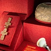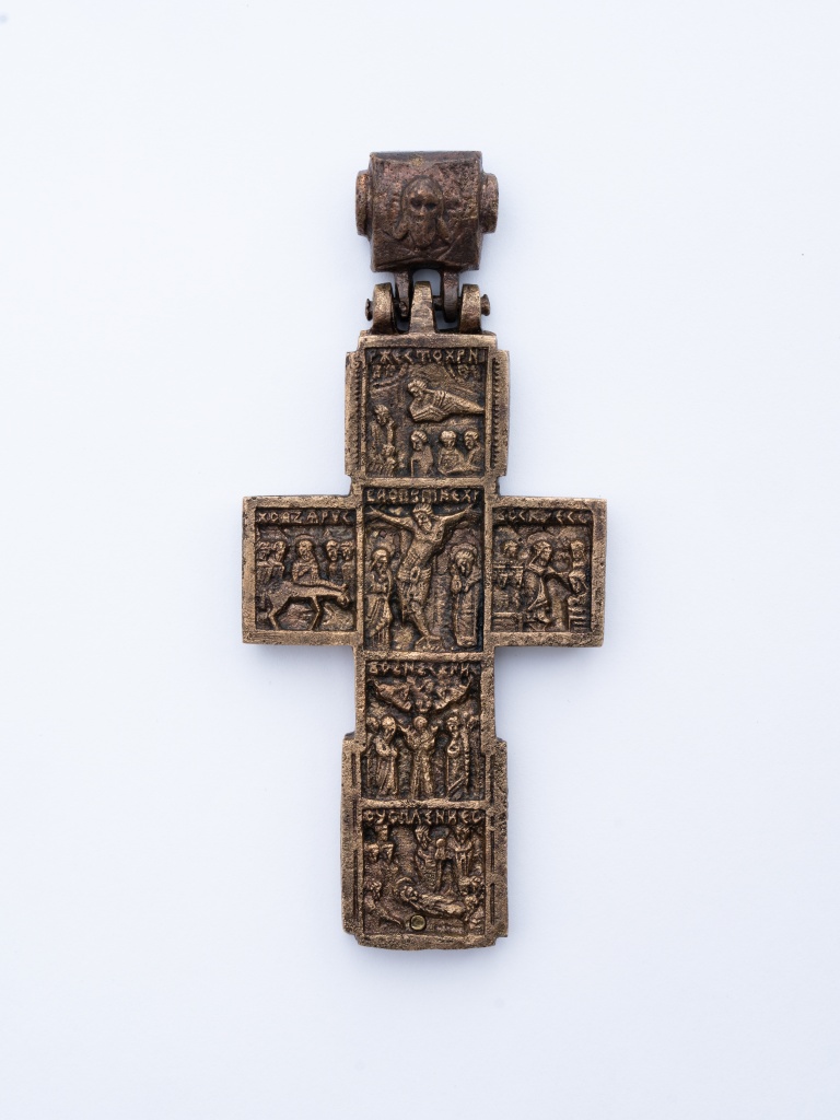 Двустворчатый крест с оглавием-петлей выполнен в технике литья из медного сплава, имеет высокий горизонтальный рельеф, содержит полный цикл сцен Великих и Господских праздников на период до XV-XVI вв. с изображением сцены Распятия в лицевом средокрестии.