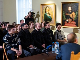 В Парадном зале Ризницы встретились молодежные сообщества Сергиево-Посадского филиала ВГИК, Московской духовной академии и представители Молодежных Советов Центрального музея древнерусской культуры и искусства имени Андрея Рублёва и нашего музея.