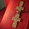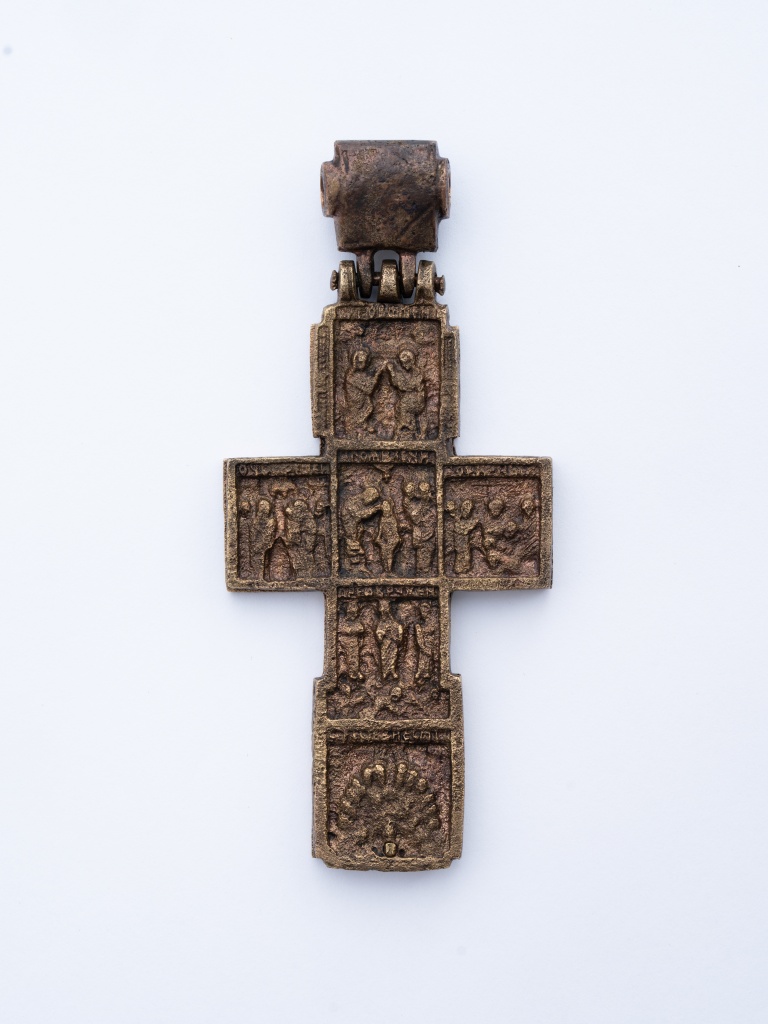 Двустворчатый крест с оглавием-петлей выполнен в технике литья из медного сплава, имеет высокий горизонтальный рельеф, содержит полный цикл сцен Великих и Господских праздников на период до XV-XVI вв. с изображением сцены Распятия в лицевом средокрестии.